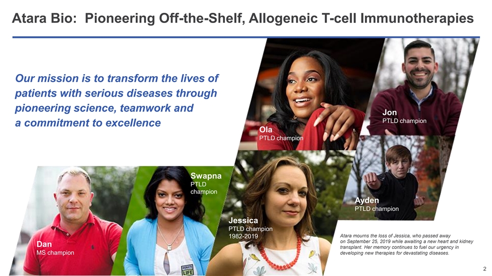 Atara Bio: Pioneering Off-the-Shelf, Allogeneic T-cell Immunotherapies Our mission is to transform the lives of patients with serious diseases through pioneering science, teamwork and Jon PTLD champion a commitment to excellence Ola PTLD champion Swapna PTLD champion Ayden PTLD champion Jessica PTLD champion Atara mourns the loss of Jessica, who passed away 1982-2019 on September 25, 2019 while awaiting a new heart and kidney Dan transplant. Her memory continues to fuel our urgency in MS champion developing new therapies for devastating diseases. 2Atara Bio: Pioneering Off-the-Shelf, Allogeneic T-cell Immunotherapies Our mission is to transform the lives of patients with serious diseases through pioneering science, teamwork and Jon PTLD champion a commitment to excellence Ola PTLD champion Swapna PTLD champion Ayden PTLD champion Jessica PTLD champion Atara mourns the loss of Jessica, who passed away 1982-2019 on September 25, 2019 while awaiting a new heart and kidney Dan transplant. Her memory continues to fuel our urgency in MS champion developing new therapies for devastating diseases. 2