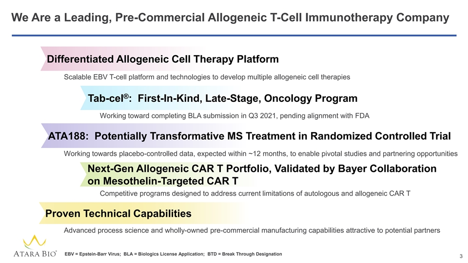 We Are a Leading, Pre-Commercial Allogeneic T-Cell Immunotherapy Company Differentiated Allogeneic Cell Therapy Platform Scalable EBV T-cell platform and technologies to develop multiple allogeneic cell therapies ® Tab-cel : First-In-Kind, Late-Stage, Oncology Program Working toward completing BLA submission in Q3 2021, pending alignment with FDA ATA188: Potentially Transformative MS Treatment in Randomized Controlled Trial Working towards placebo-controlled data, expected within ~12 months, to enable pivotal studies and partnering opportunities Next-Gen Allogeneic CAR T Portfolio, Validated by Bayer Collaboration on Mesothelin-Targeted CAR T Competitive programs designed to address current limitations of autologous and allogeneic CAR T Proven Technical Capabilities Advanced process science and wholly-owned pre-commercial manufacturing capabilities attractive to potential partners EBV = Epstein-Barr Virus; BLA = Biologics License Application; BTD = Break Through Designation 3We Are a Leading, Pre-Commercial Allogeneic T-Cell Immunotherapy Company Differentiated Allogeneic Cell Therapy Platform Scalable EBV T-cell platform and technologies to develop multiple allogeneic cell therapies ® Tab-cel : First-In-Kind, Late-Stage, Oncology Program Working toward completing BLA submission in Q3 2021, pending alignment with FDA ATA188: Potentially Transformative MS Treatment in Randomized Controlled Trial Working towards placebo-controlled data, expected within ~12 months, to enable pivotal studies and partnering opportunities Next-Gen Allogeneic CAR T Portfolio, Validated by Bayer Collaboration on Mesothelin-Targeted CAR T Competitive programs designed to address current limitations of autologous and allogeneic CAR T Proven Technical Capabilities Advanced process science and wholly-owned pre-commercial manufacturing capabilities attractive to potential partners EBV = Epstein-Barr Virus; BLA = Biologics License Application; BTD = Break Through Designation 3