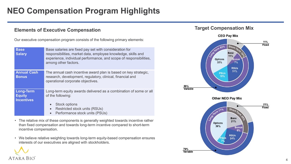 NEO Compensation Program Highlights Target Compensation Mix Elements of Executive Compensation Our executive compensation program consists of the following primary elements: Base Base salaries are fixed pay set with consideration for Salary responsibilities, market data, employee knowledge, skills and experience, individual performance, and scope of responsibilities, among other factors. Annual Cash The annual cash incentive award plan is based on key strategic, Bonus research, development, regulatory, clinical, financial and operational corporate objectives. Long-Term Long-term equity awards delivered as a combination of some or all Equity of the following: Incentives • Stock options • Restricted stock units (RSUs) • Performance stock units (PSUs) • The relative mix of these components is generally weighted towards incentive rather than fixed compensation and towards long-term incentive compared to short-term incentive compensation. • We believe relative weighting towards long-term equity-based compensation ensures interests of our executives are aligned with stockholders. 4NEO Compensation Program Highlights Target Compensation Mix Elements of Executive Compensation Our executive compensation program consists of the following primary elements: Base Base salaries are fixed pay set with consideration for Salary responsibilities, market data, employee knowledge, skills and experience, individual performance, and scope of responsibilities, among other factors. Annual Cash The annual cash incentive award plan is based on key strategic, Bonus research, development, regulatory, clinical, financial and operational corporate objectives. Long-Term Long-term equity awards delivered as a combination of some or all Equity of the following: Incentives • Stock options • Restricted stock units (RSUs) • Performance stock units (PSUs) • The relative mix of these components is generally weighted towards incentive rather than fixed compensation and towards long-term incentive compared to short-term incentive compensation. • We believe relative weighting towards long-term equity-based compensation ensures interests of our executives are aligned with stockholders. 4