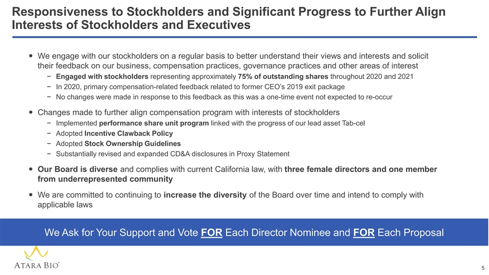 Responsiveness to Stockholders and Significant Progress to Further Align Interests of Stockholders and Executives We engage with our stockholders on a regular basis to better understand their views and interests and solicit their feedback on our business, compensation practices, governance practices and other areas of interest − Engaged with stockholders representing approximately 75% of outstanding shares throughout 2020 and 2021 − In 2020, primary compensation-related feedback related to former CEO’s 2019 exit package − No changes were made in response to this feedback as this was a one-time event not expected to re-occur Changes made to further align compensation program with interests of stockholders − Implemented performance share unit program linked with the progress of our lead asset Tab-cel − Adopted Incentive Clawback Policy − Adopted Stock Ownership Guidelines − Substantially revised and expanded CD&A disclosures in Proxy Statement Our Board is diverse and complies with current California law, with three female directors and one member from underrepresented community We are committed to continuing to increase the diversity of the Board over time and intend to comply with applicable laws We Ask for Your Support and Vote FOR Each Director Nominee and FOR Each Proposal 5Responsiveness to Stockholders and Significant Progress to Further Align Interests of Stockholders and Executives We engage with our stockholders on a regular basis to better understand their views and interests and solicit their feedback on our business, compensation practices, governance practices and other areas of interest − Engaged with stockholders representing approximately 75% of outstanding shares throughout 2020 and 2021 − In 2020, primary compensation-related feedback related to former CEO’s 2019 exit package − No changes were made in response to this feedback as this was a one-time event not expected to re-occur Changes made to further align compensation program with interests of stockholders − Implemented performance share unit program linked with the progress of our lead asset Tab-cel − Adopted Incentive Clawback Policy − Adopted Stock Ownership Guidelines − Substantially revised and expanded CD&A disclosures in Proxy Statement Our Board is diverse and complies with current California law, with three female directors and one member from underrepresented community We are committed to continuing to increase the diversity of the Board over time and intend to comply with applicable laws We Ask for Your Support and Vote FOR Each Director Nominee and FOR Each Proposal 5