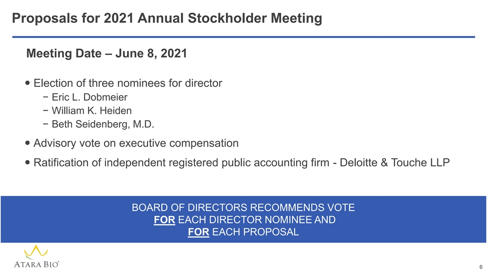 Proposals for 2021 Annual Stockholder Meeting Meeting Date – June 8, 2021 Election of three nominees for director − Eric L. Dobmeier − William K. Heiden − Beth Seidenberg, M.D. Advisory vote on executive compensation Ratification of independent registered public accounting firm - Deloitte & Touche LLP BOARD OF DIRECTORS RECOMMENDS VOTE FOR EACH DIRECTOR NOMINEE AND FOR EACH PROPOSAL 6Proposals for 2021 Annual Stockholder Meeting Meeting Date – June 8, 2021 Election of three nominees for director − Eric L. Dobmeier − William K. Heiden − Beth Seidenberg, M.D. Advisory vote on executive compensation Ratification of independent registered public accounting firm - Deloitte & Touche LLP BOARD OF DIRECTORS RECOMMENDS VOTE FOR EACH DIRECTOR NOMINEE AND FOR EACH PROPOSAL 6